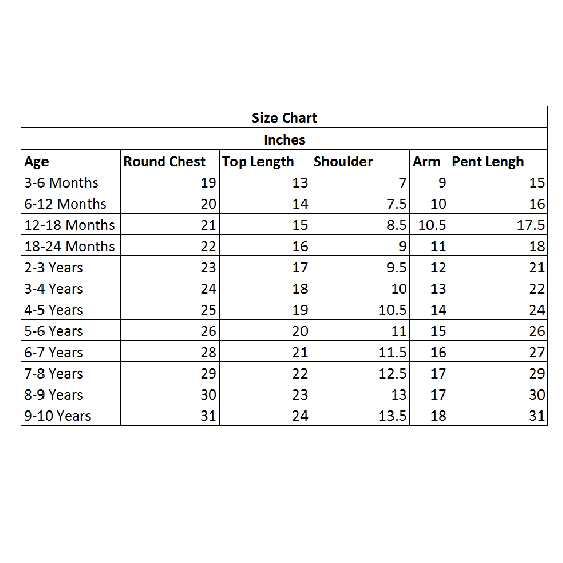 | Size | 3 – 6 Month, 6 – 12 Month, 12 – 18 Month, 18 – 24 Month, 2 – 3 Years, 3 – 4 Years, 4 – 5 Years, 5 – 6 Years, 6 – 7 Years, 7 – 8 Years, 8 – 9 Years, 9 – 10 Years |